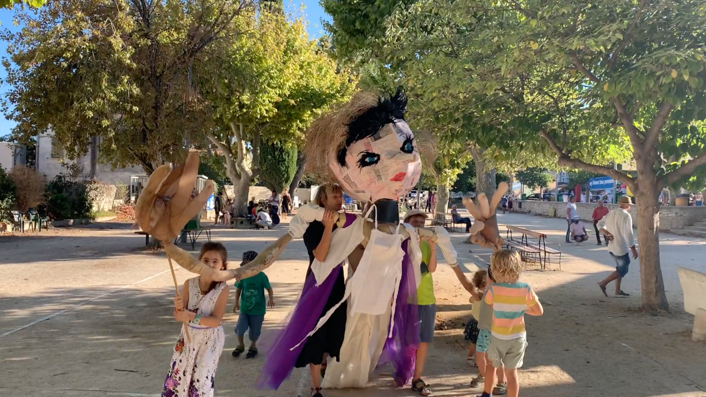 Collectif la Culture ça urge, Atelier Libre des enfants Grandeur Nature, de 15h à 22h, Samedi 5 septembre 2021 au Cercle des Bulomanes, La Ciotat. Nous avons créé la grande figure de Polina au cours de l’été lors d’un stage avec Giusi, Lona, Aulne, Olivia, Sarah… en vue de la rencontre culturelle du 5 septembre 2021.