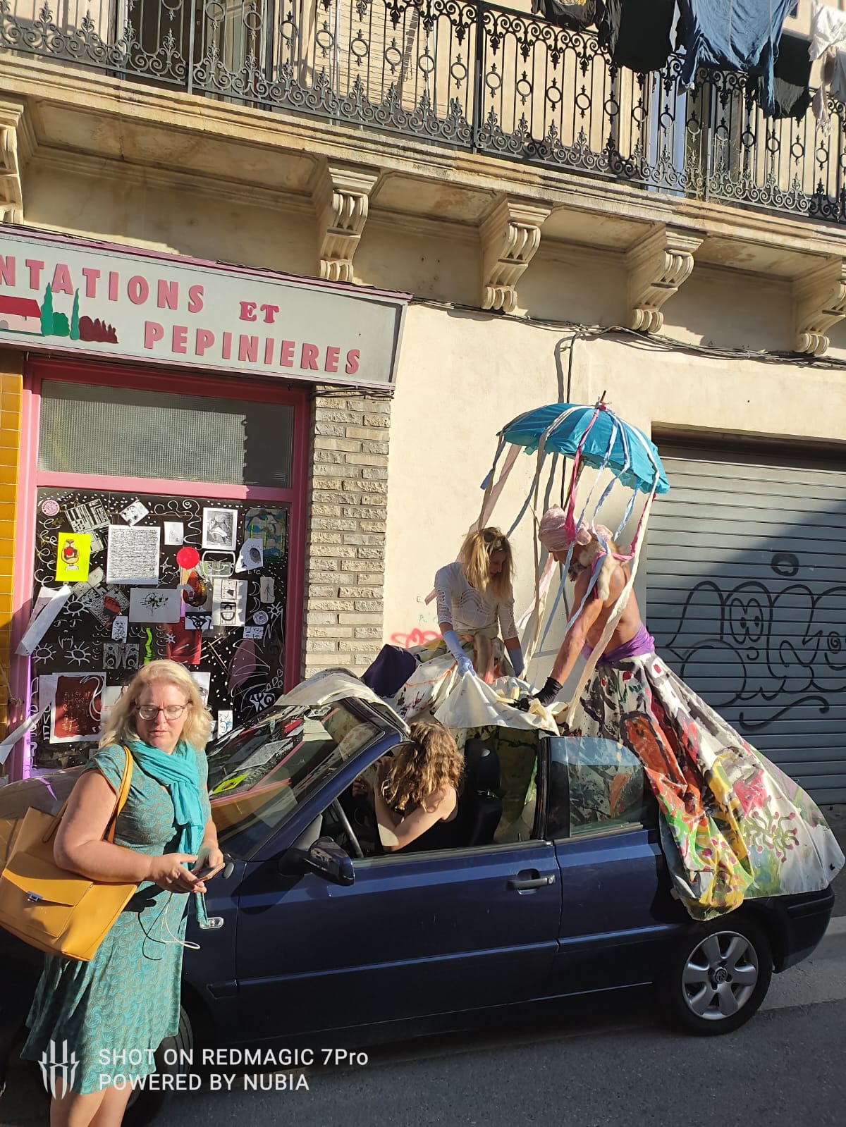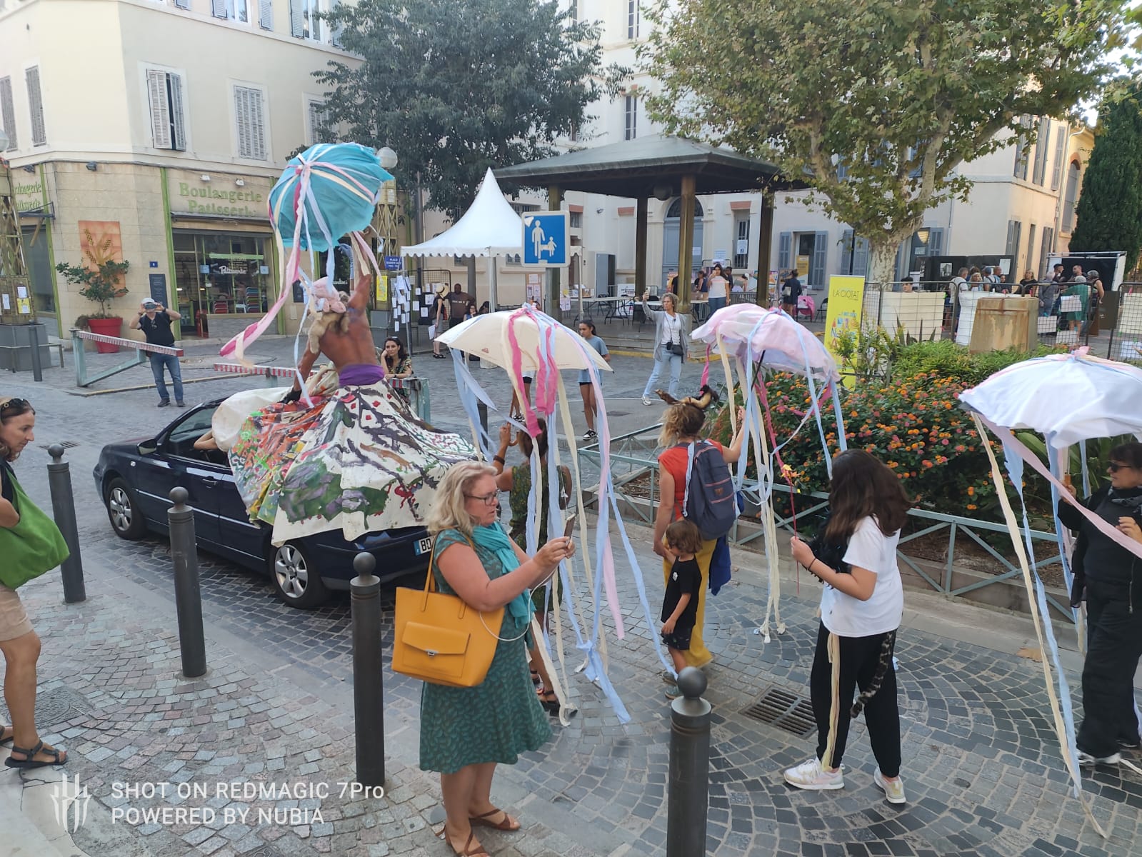 Navigart’s, Parade enchanté devant A.Polina et autour du cinéma Lumière, création des grandes robes, au son de la Flûte enchantée de Mozart, La Ciotat, juin 2023 (photographies de Françoise et Sylvie)